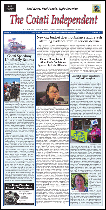 Headlines in the first issue include: “New city budget does not balance and reveals alarming evidence town in serious decline,” “Cotati Speedway Unofficially Returns,” “Convicted Money Launderers in Cotati Laying Low” and “Citizen Complaints of Ethics Code Violations Ignored by Officials.”