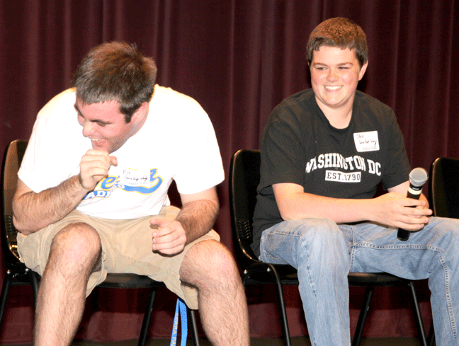 Kit Dicioccio, left, and Jack Heffernon, of Serra High School in San Mateo, discuss some of the more humorous experiences they have had on their school’s newspaper. Below, Alexis Stewart of Jefferson High School in Daly City talks about how she and her fellow staffers are working to improve their newspaper. They were part of a panel discussion of student journalists yesterday, hosted by the San Francisco Peninsula Press Club. The discussion was at the conclusion of an annual boot camp to hone the skills of more than 200 high school journalists held at the College of San Mateo. Photos by Dave Price.