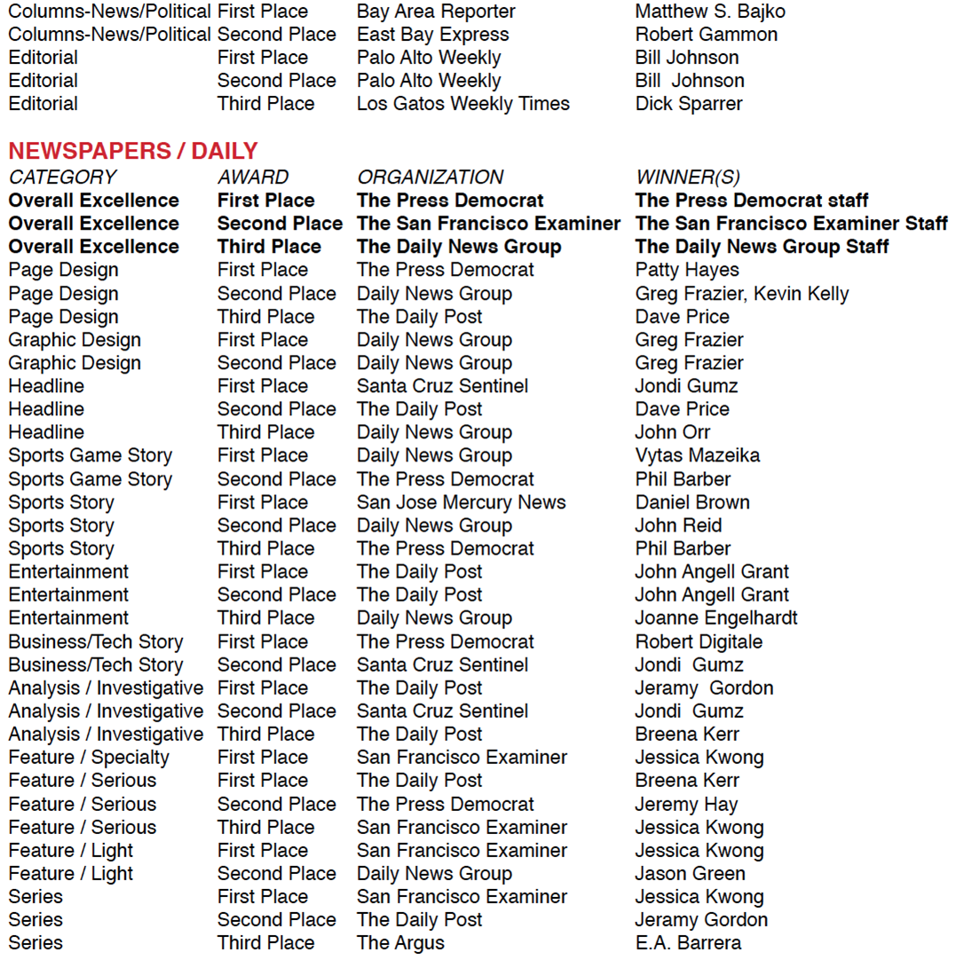 The club received received 398 entries from the 11 counties in the Bay Area. The contest was judged by press clubs in Cleveland, Florida, New Orleans, Orange County and Kern County.